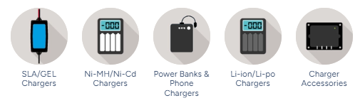 We have a range of battery chargers, for use with lead acid, SLA, AGM, and Lithium batteries used in cars and other equipment. We also have phone chargers and solar chargers.