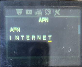 Once you have updated the firmware, switch the three-position switch to the middle SETUP position, press the MENU button, use the right arrow to go to the Cellular menu (satellite dish), then press the down arrow to go to APN, and press OK. Use the up/down arrows to enter the APN letters and full-stops as needed, and press the right arrow to go to the next letter. Press OK when done to save.