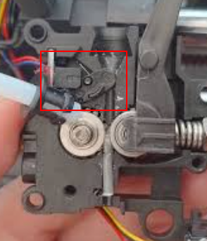 Be careful with the extruder when separating it into two halves, as there is a filament sensor with a small cam and spring inside it (red area below), and these can easily be lost if you are not ready to catch them.