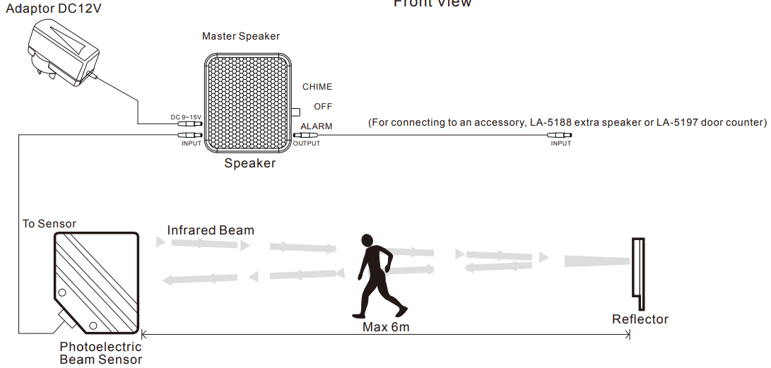 The LA5193 sits on one side of a doorway, and sends out a beam to a reflector stuck on the other side.